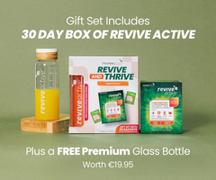 Discover your ultimate energy and immune system support. The Revive and Thrive Gift Set contains 30 sachets of Revive Active plus a premium glass bottle to energise your day.